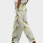 Tyto ležérní kalhoty mají lehký a pohodlný materiál ozdobený jemným květinovým potiskem v zelených odstínech, který působí svěže a originálně. Volný střih poskytuje maximální volnost pohybu a stahovací šňůrka v pase umožňuje ideální přizpůsobení, takže jsou kalhoty perfektní pro letní a uvolněné outfity.
