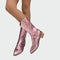 Tyto kovově růžové kozačky mají výrazný a moderní vzhled, spojují dekorativní westernové výšivky s praktickým bočním zipem pro snadné obouvání. Elegantní lesklý materiál dodává futuristický nádech a nízký podpatek zaručuje pohodlí při každodenním nošení. Perfektní volba pro ty, kteří milují originální a nepřehlédnutelné kousky.