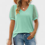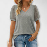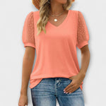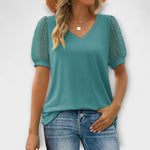 Tato halenka vyniká tylovými rukávy s jemnými vystouplými detaily, které vytvářejí něžný a elegantní vzhled. Hladké tělo z příjemné látky zajišťuje pohodlí a výstřih do V dodává moderní a sofistikovaný styl, vhodný jak pro běžné, tak i elegantnější outfity.