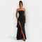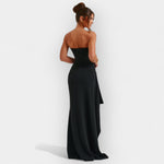 Tyto dlouhé šaty bez ramínek mají elegantní střih se subtilními záhyby na živůtku, které poskytují oporu a vytvářejí upravený vzhled. Prodloužená sukně s vysokým rozparkem opticky prodlužuje postavu a dodává smyslný efekt, zatímco boční řasení přidává pohyb i sofistikovanou strukturu. Jsou perfektní volbou pro formální události nebo večery, kdy chcete působit výrazně a kultivovaně.