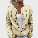 Tento Kardigan s Včelím Motivem zaujme jemným vzorem malých včel rovnoměrně rozložených na světlém úpletu, který působí přirozeně, hravě a velmi harmonicky. Měkký materiál, zapínání na knoflíky a pohodlný střih z něj činí ideální kousek pro každodenní nošení s nenápadným venkovským kouzlem.