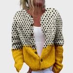 Tento Tečkovaný Kardigan zaujme výrazným puntíkovaným vzorem v kombinaci s odvážným barevným kontrastem, který vytváří moderní a sebevědomý vzhled. Jasně oddělené barevné plochy podtrhují design, zatímco pohodlný úplet, zapínání na knoflíky a uvolněný střih zajišťují komfort při každodenním nošení.
