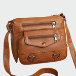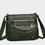 Milada – Kabelka s kapsami je vyrobena z měkké pravé kůže ve vintage stylu a je ideální pro ženy, které ocení praktičnost i styl. Kompaktní tvar doplňuje několik vnějších kapes na zip, díky nimž máte všechny drobnosti přehledně uspořádané a snadno dostupné. Nastavitelný popruh umožňuje nošení přes rameno nebo křížem přes tělo a kovové detaily ve tvaru srdce dodávají kabelce jemný a ženský charakter.
