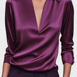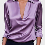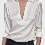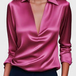 Adéla - Saténová košile vyzařuje rafinovaný luxus díky vysoce kvalitnímu saténu a sofistikovanému výstřihu do V. Hedvábně jemný povrch je příjemný na dotek a zaručuje pohodlí po celý den. Košile je vytvořena s pečlivou ruční prací a ohledem na její původ: vybrané materiály, diskrétní švy a lesk, který vydrží po celé sezóny.