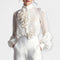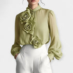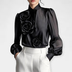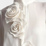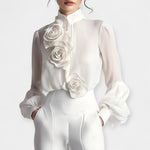 Tato bílá blůza s působivými 3D aplikacemi ve tvaru růží dodá vašemu stylu nádech romantiky a luxusu. Vysoký límec a decentně průsvitná látka dodávají vzdušnou, elegantní siluetu, ideální pro kombinaci s na míru šitými kalhotami nebo sukněmi..