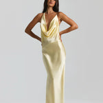 Tyto dlouhé saténové šaty elegantně splývají po těle a vytvářejí fluidní, sofistikovanou siluetu. Hluboký drapovaný výstřih dodává smyslnost, aniž by ubralo na jemnosti, zatímco tenká ramínka a lesklý materiál zajišťují lehký a éterický vzhled. Přirozená splývavost saténu zvýrazňuje každý pohyb, díky čemuž jsou tyto šaty ideální pro galavečery, formální večeře či příležitosti, kde jemný glamour hraje hlavní roli.