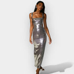 Tyto dlouhé šaty pokryté flitry vytvářejí ohromující zrcadlový lesk, který jemně obepíná postavu a působí elegantně i výrazně. Hranatý výstřih a pevná ramínka vyvažují modernost a třídu, zatímco úzký střih zvýrazňuje křivky s maximální elegancí. Jejich zářivý efekt promění každý vstup v nezapomenutelný okamžik, což z nich činí ideální volbu pro okázalé večerní události.