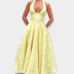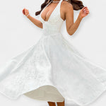 Tato midi róba s hlubokým halter výstřihem spojuje smyslnost a eleganci v dokonale vyváženém designu, doplněném o květovaný žakárový materiál, který dodává sofistikovaný vzhled. Pevně tvarovaný pas krásně formuje postavu, zatímco široká sukně vytváří plynulý pohyb, díky čemuž jsou šaty ideální pro příležitosti vyžadující nádech vintage půvabu i modernosti.