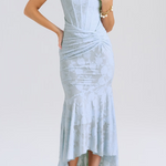 Tyto dlouhé šaty mají korzetově tvarovaný živůtek a texturovanou krajku, která obepíná postavu sošným a výrazně ženským způsobem. Postranní řasení zvýrazňuje pas a dodává pohyb, zatímco střih ve stylu mořské panny s jemnou vlečkou opticky prodlužuje siluetu. Jsou to šaty spojující luxus, smyslnost a sofistikovanost – ideální pro výjimečné události, kde je žádoucí okouzlující přítomnost.