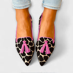 Tento dámský mokasín s potiskem žirafy je doplněn jemnými frędlemi a detaily v jasně růžové. Kontrast barev přidává outfitu odvahu, ideální pro ty, kteří chtějí přidat moderní a jedinečný vzhled. Navíc nabízí pohodlí pro každodenní nošení.