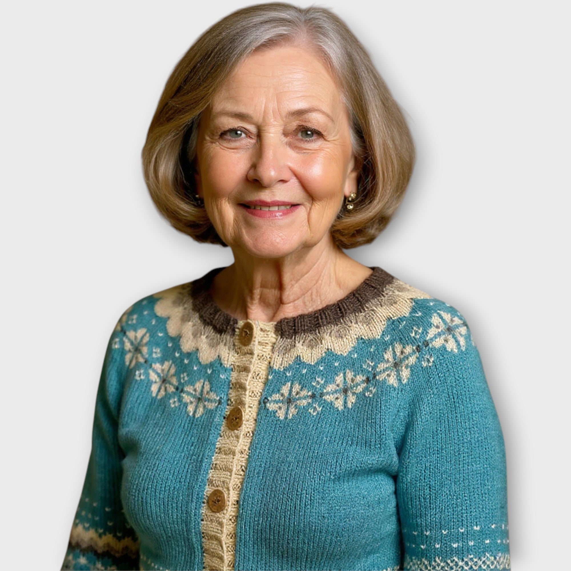 Tento pletený svetr s knoflíky vyniká jemným modrozeleným odstínem doplněným klasickými vzory v béžové a hnědé barvě, které vytvářejí nadčasový a vyvážený vzhled. Přední zapínání na knoflíky dodává praktičnost a umožňuje nosit svetr otevřený nebo zapnutý podle potřeby. Pohodlný a hřejivý kousek ideální pro vrstvení v chladnějších dnech.