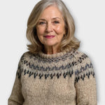 Tento pletený svetr v rustikálním stylu zaujme tradičním vzorem v přírodních tónech, který působí hřejivě a autenticky. Vyšší výstřih a pevnější pletenina z něj dělají ideální volbu do chladných dnů, kdy poskytuje maximální pohodlí bez ztráty elegance. Nadčasový kousek pro ty, kteří mají rádi jednoduchý, teplý a charakteristický vzhled.