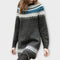 Tento dlouhý pletený svetr spojuje pohodlí a eleganci v prodlouženém střihu, který lze nosit jako tuniku nebo krátké svetrové šaty. Geometrický vzor v odstínech šedé, bílé a modré vytváří vyvážený a sofistikovaný vzhled, zatímco rovný střih a kulatý výstřih zajišťují komfort při každodenním nošení. Ideální volba do chladných dnů, skvěle se kombinuje s legínami, punčochami nebo úzkými džíny.