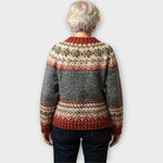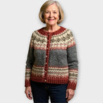 Tento pletený svetr nabízí klasický a hřejivý vzor doplněný předním zapínáním s knoflíky, které dodávají praktičnost i tradiční půvab. Kombinace teplých barevných tónů a propracovaných detailů vytváří nadčasový vzhled ideální do chladnějších dnů. Pohodlný střih umožňuje nosit svetr zapnutý i rozepnutý, což z něj činí univerzální kousek pro každodenní nošení.
