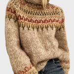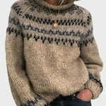 Silný pletený svetr v přírodním béžovém odstínu s jemným geometrickým vzorem v horní části a na manžetách. Má pohodlný vysoký límec, dlouhé rukávy a řemeslné zpracování, které působí hřejivě, elegantně a nadčasově.