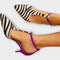 Safari Chic podpatky Mirela spojují zebří vzor s výraznými fialovými detaily, což vytváří odvážný a elegantní styl. Špičatá špička opticky prodlužuje nohu a tenký pásek kolem kotníku zajišťuje pohodlí i stabilitu. Ideální pro ty, kteří hledají moderní a umělecký doplněk plný osobitosti.