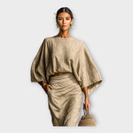 Tyto „šaty“, inspirované dvoudílnou soupravou, vynikají přirozenou texturou a elegantním střihem. Široký horní díl vytváří lehký pohyb, zatímco drapovaná sukně opticky prodlužuje postavu a dodává sofistikovanost. Jsou ideální pro podzimní dny, kdy chcete působit bohémsky, elegantně a zároveň pohodlně.