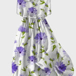 Retro šaty Lída - Květinové šaty kombinují jemnost a eleganci s fialovými květinami na bílém pozadí. Vyrobené z lehké a prodyšné látky, jsou ideální pro slunečné dny a venkovní procházky. Pásek v pase zvýrazňuje siluetu a kulatý límec dodává kouzelný vintage nádech.