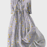 Retro šaty Vendula - Šaty Jemné kopretiny kombinují kouzlo a jemnost s potiskem malých bílých a žlutých kopretin na lila pozadí. Vyrobené z lehké a volné látky, poskytují pohodlí a přirozený pohyb. Pásek v pase zvýrazňuje siluetu, zatímco kulatý límec a knoflíky vpředu dodávají okouzlující vintage nádech. Ideální pro denní procházky, neformální akce nebo příležitosti, kde chcete působit lehce a ženský.