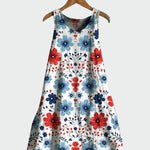 Tyto bezrukávové šaty mají květinový potisk inspirovaný folklorními vzory, s květy v modrých a červených tónech uspořádanými symetricky, což vytváří živý a harmonický vzhled. Světlý podklad zvýrazňuje jemné detaily a dodává modelu svěžest a lehkost. Volný střih poskytuje maximální pohodlí, ideální pro teplé dny, venkovní slavnosti nebo pro každého, kdo má rád veselé kousky s moderně pojatou tradicí.