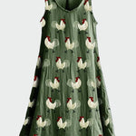Tyto bezrukávové šaty mají půvabný, venkovsky laděný potisk bílých kohoutů s červenými detaily na tmavě zeleném pozadí, které působí útulně a harmonicky. Měkká látka a volný střih poskytují celodenní pohodlí a volnost pohybu, čímž vytvářejí ležérní a příjemný styl. Je to hravý a originální kousek pro každého, kdo má rád módu s osobitostí a jemným venkovským nádechem.