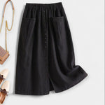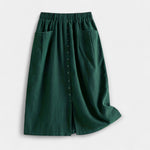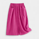 Tato žlutá midi sukně vyniká předními knoflíky, které jí dodávají ležérní a moderní vzhled. Lehká látka zajišťuje přirozený pohyb a elastický pas poskytuje pohodlí po celý den. Nenápadné kapsy zvyšují praktičnost, díky čemuž je sukně ideální pro všestranné a uvolněné outfity.