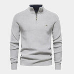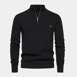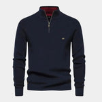 Tento vytříbený námořnicky modrý svetr má nenápadný půlzip, který dodává praktičnost i moderní vzhled. Červená podšívka vytváří jemný, elegantní kontrast a měkký materiál zajišťuje celodenní pohodlí. Díky čistému a univerzálnímu střihu se snadno kombinuje s ležérními i upravenějšími outfity, což z něj činí ideální volbu pro stylový, ale decentní vzhled.