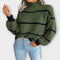 Tento svetr má jemné pruhy na zeleném podkladu, což vytváří moderní a ležérní vzhled. Silný materiál a vyšší límec poskytují teplo a pohodlí v chladných dnech, zatímco volnější střih umožňuje volnost pohybu a snadno se kombinuje s džínami nebo casual kalhotami pro univerzální outfit.