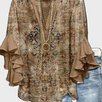 Radka – Boho Halenka v Zemitých Tónech spojuje vintage tapisériový vzor s teplými odstíny a jemnými detaily. Volánové rukávy dodávají ženský a vzdušný charakter, ideální pro pohodlné outfity s uměleckým nádechem.