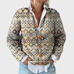 Tento Geometrický Kardigan vyniká detailním vzorem s řemeslnou inspirací, kde se prolínají geometrické tvary a jemné barvy pro výrazný a sofistikovaný vzhled. Pohodlný úplet v kombinaci se zapínáním na knoflíky a volnějším střihem z něj činí ideální kousek pro oživení ležérních outfitů s originálním charakterem.