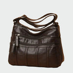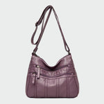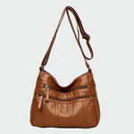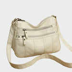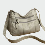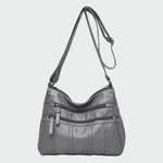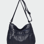 Katarin – Praktická kabelka je vyrobena z pravé černé kůže a navržena pro pohodlné každodenní nošení. Lehký a poddajný tvar se přirozeně přizpůsobí tělu, zatímco několik vnějších zipů umožňuje přehledné uspořádání všech nezbytností. Nastavitelný popruh zajišťuje komfort při nošení přes rameno nebo křížem přes tělo, což z této kabelky dělá spolehlivého a univerzálního společníka.