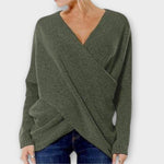 Tento svetr má elegantní překládaný střih, který vytváří jemný výstřih do V a ženskou siluetu bez námahy. Měkký a mírně prodloužený materiál zajišťuje pohodlí po celý den, zatímco univerzální styl umožňuje kombinaci s kalhotami, sukněmi nebo džínami pro ležérní či mírně sofistikovaný vzhled.