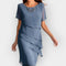 Tyto modré šaty s vícevrstvým designem nabízejí elegantní a plynulý vzhled, ideální pro ženy, které hledají pohodlí spojené s jemným šarmem. Diagonální vrstvy vytvářejí zajímavý pohyb a opticky zjemňují postavu, zatímco krátké lehké rukávy dodávají celku jemnost. Rovný střih a měkká látka činí tyto šaty perfektní volbou pro formální události, slavnostní večeře nebo příležitosti, kde je důležitá nenápadná elegance.